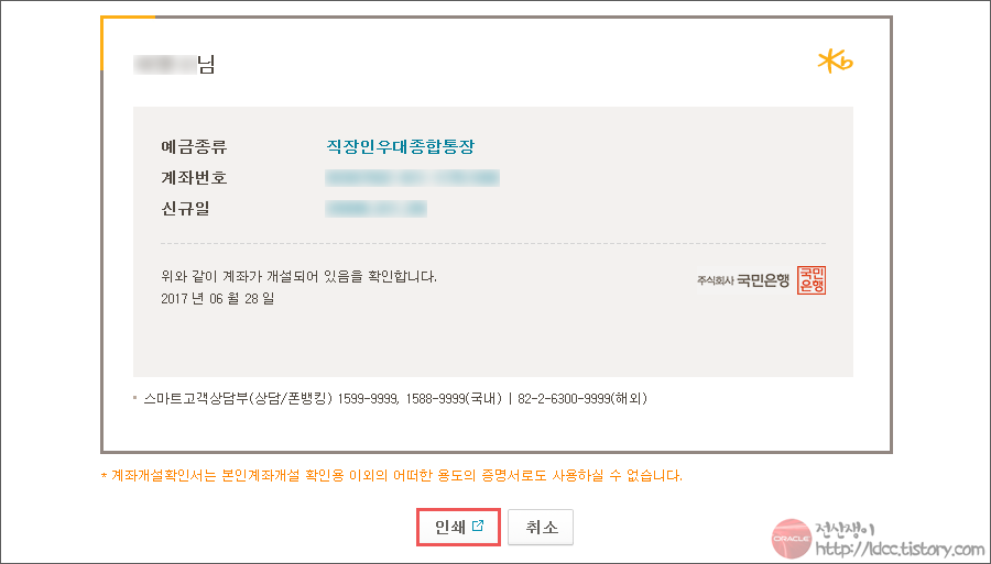 ※ 계좌개설확인서는 본인계좌개설 확인용 이외의 어떠한 용도의 증명서로도 사용하실 수 없습니다. 라는 메시지가 있지만, 급여 이체 등을 위해 제출할 경우 아무런 문제가 없습니다.