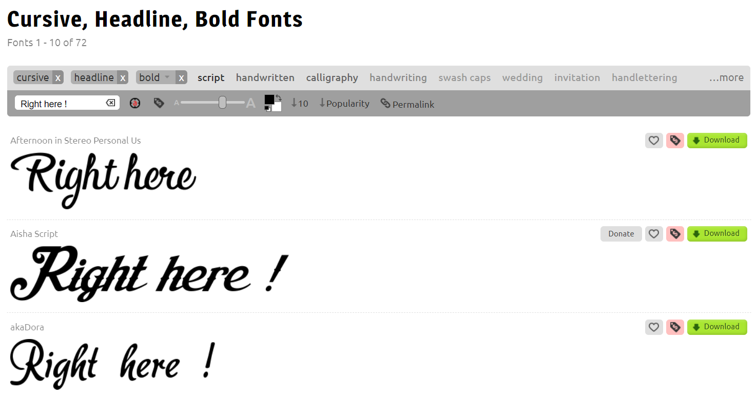 첫 번 째 사이트도 마찬가지지만 메뉴에서 Bold나 Handwritten 등의 옵션을 선택해주면 더욱 많은 선택지를 가질 수가 있게 됩니다 ㅎ