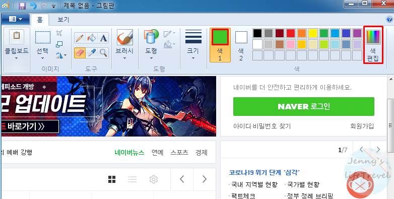 Ctrl + V키는 붙여넣기로 스크린샷 사진을 그림판에 불러오는 기능입니다. 원하는 색상이 있는 사진 파일이 있을 경우 해당 파일을 그림판으로 불러오시면 됩니다.