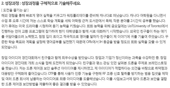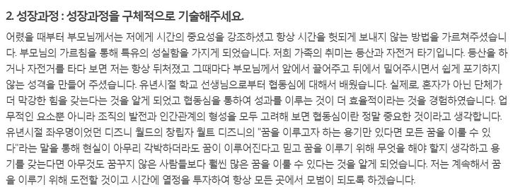 성장과정의 참 의도가 무엇인지를 파악을 해야합니다. 의도를 파악하고, 면접관이 듣고싶어하는 것이 무엇인지를 아셔야 합니다.