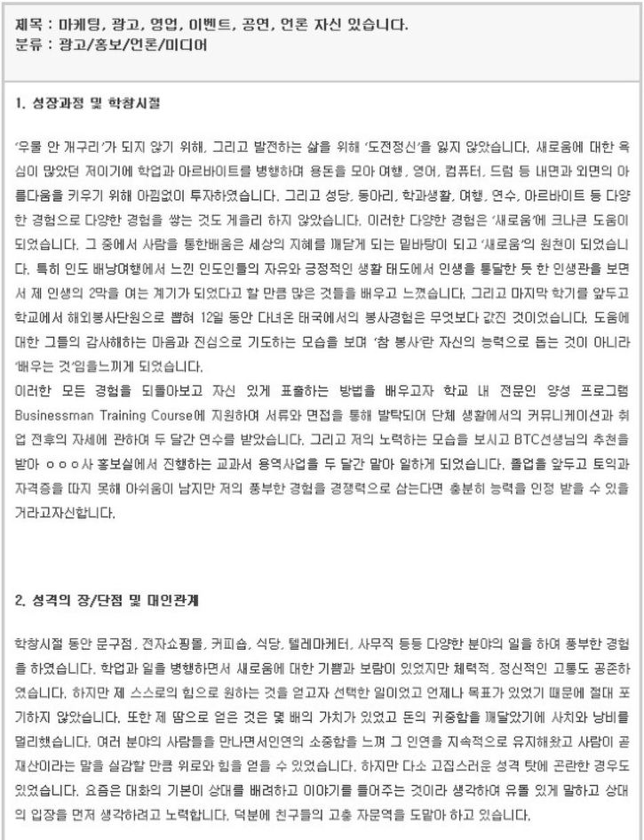 자기소개서 잘 쓴 예를 많이 보면 쓰는데에 정말 많은 도움이 됩니다.