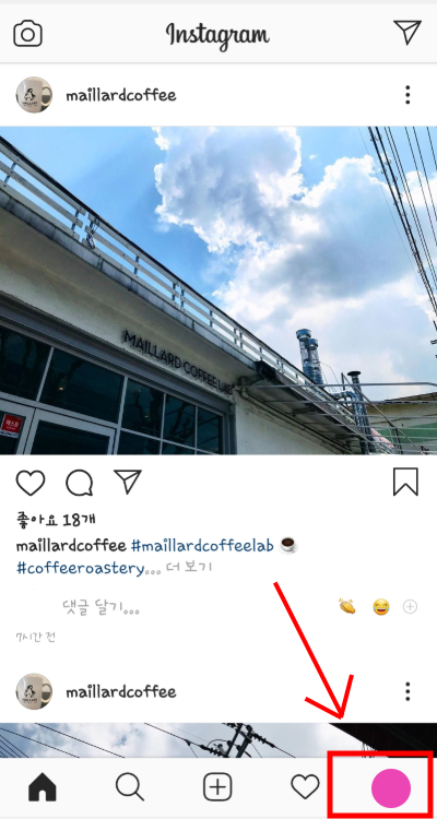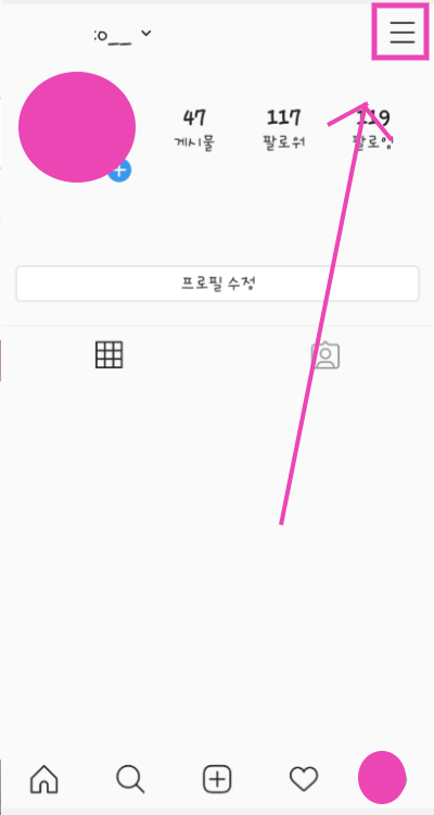 인스타 앱을 실행시켜주면 하단에 내 사진을 클릭하여 들어갑니다.