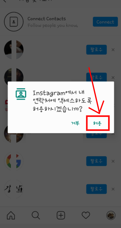 만약 처음이시라면 인스타그램에 연락처 액세스를 허용해주셔야 합니다. 그러면 이제 완료가 됩니다.