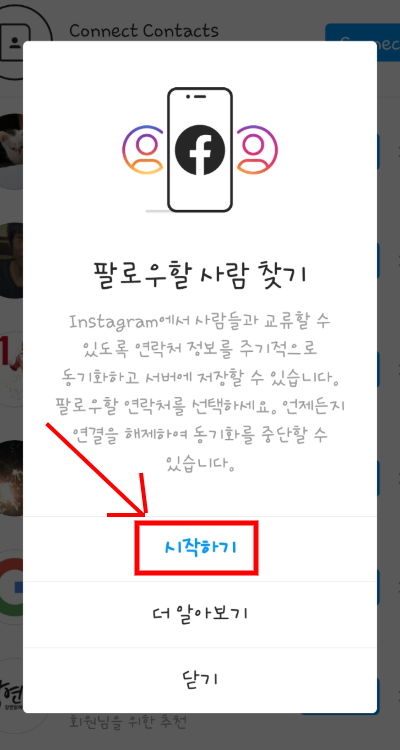 인스타 연락처로 사람찾기는 어렵지 않습니다. 이제 거의 다 왔습니다. 시작하기를 눌러 팔로우할 사람을 찾아줍니다.
