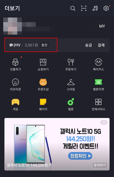 카카오페이메뉴로 진입 후에 빨간 동그라미 쳐진