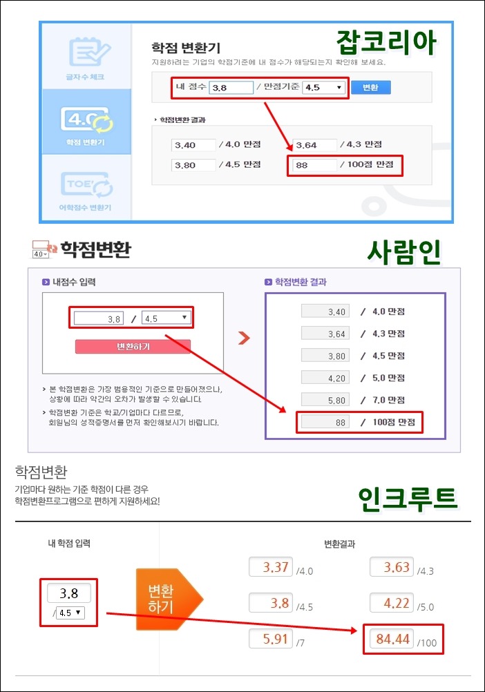 그리고 학점을 백분율로 구하고 싶으신 분들이 많으신것 같아 여러 사이트를 찾아보았습니다. 물론 위의 네이버에서도 밑에 보시면 82.7%라고 나오기는 하는데요.. 각종 취업포털사이트에 방문해보시면 [학점변환기]를 제공하는 곳이 많으니 이를 활용해보셔도 괜찮을것 같습니다.