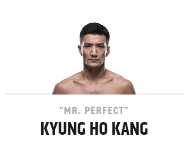 강경호: 현 ufc 밴텀급 파이터로 6승 2패 1무효의 전적을 갖고 있습니다. 별명은 '미스터 퍼펙트'라고 하며 스타일은 그래플링을 많이 하는 걸로 보입니다. 꽤 많은 경기를 했는데도 TOP 15 랭킹 안에 들어가지 못해 조금 아쉬운데요. 군 복무 때문에 중간에 텀이 비어서 이런 상황이 발생한 것 같습니다. 머지않아 TOP 15 랭킹 안에 들어갈 것 같습니다.