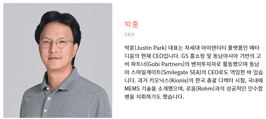 박훈(Justin Park) 대표는 차세대 아이덴티티 플랫폼인 메타디움의 현재 CEO입니다. GS 홈쇼핑 및 동남아시아 기반의 고비 파트너(Gobi Partners)의 벤처투자자로 활동했으며 동남아 스마일게이트(Smilegate SEA)의 CEO로도 역임한 바 있습니다. 과거 키오닉스(Kionix)의 한국 총괄 디렉터 시절, 국내에 MEMS 기술을 소개했으며, 로옴(Rohm)과의 성공적인 인수합병을 지휘하기도 했습니다.
