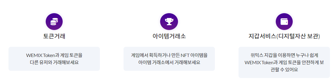 위믹스는 사용자들에게 지갑과 디지털 자산 (대체불가토큰 및 대체가능토큰) 마켓플레이스 그리고 게임 아이템 거래소 기능을 제공하는 블록체인 기반 게임 생태계 플랫폼입니다. 위믹스는 기존의 게임 플랫폼 내에 블록체인과 토큰 이코노미를 결합하여 게임 내 자산 가치 보장과 사용자 친화적 서비스 제공, 그리고 개발자의 개발 환경을 개선하고자 합니다.
