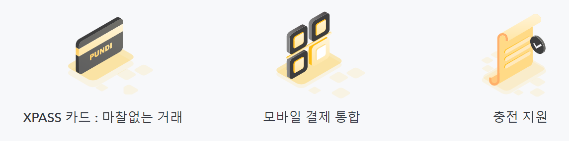 또한, 비접촉식 신용카드와 흡사한 펀디엑스 패스 카드(XPASS Card)를 발행해 이용자들이 해당 카드로 가상자산을 보다 손쉽게 충전하고 사용하는 것이 가능하다.