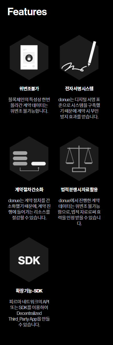 피르마체인은 블록체인의 탈중앙화 특성을 이용해 위변조 문제를 해결, 비용절감 및 전자계약의 한계점을 극복하고자 개발된 블록체인 기반 전자계약, 데이터 저장소 플랫폼입니다. 피르마체인의 전자 계약은 블록체인을 통해 협상과 거래 이력 등 모든 정보를 위변조 없이 투명하게 기록, 블록체인을 통해 인증된 라이선서와 라이센시가 직접 만날 필요 없이 플랫폼을 통해 글로벌 계약 체결이 가능합니다. 또한, 피르마체인의 데이터 저장소에는 사용자와 채굴자 간의 파일 저장 계약을 할 수 있는데 사용자는 채굴자에게 저장할 파일을 전송, 파일 전송이 완료되면 채굴자는 파일을 암호화한 후, 파일의 복제 및 암호화가 성공적으로 이뤄졌다는 파일 저장 증명을 블록체인에 전파합니다.