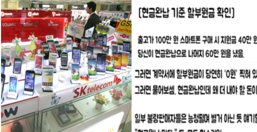 혹은 할부원금에 기기값 100만원 다 적어놓고 지원금을 현금으로 주는 경우도 있습니다.